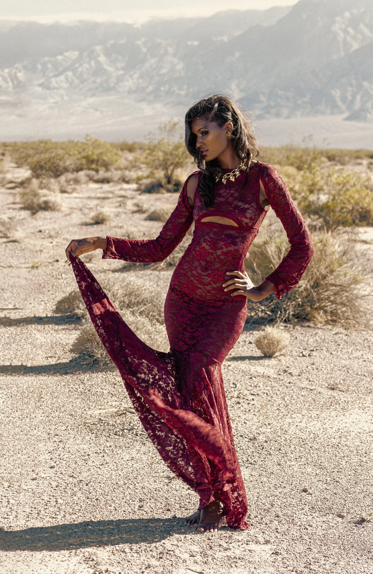 A woman in a red lace dress poses in a desert landscape with mountains in the background.