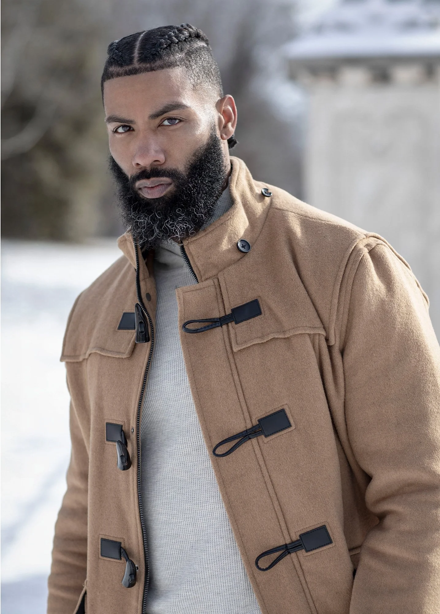 man with salt & pepper beard  and braids stands outdoors in a snowy landscape, wearing a tan coat with toggle closures and a white sweater underneath.
