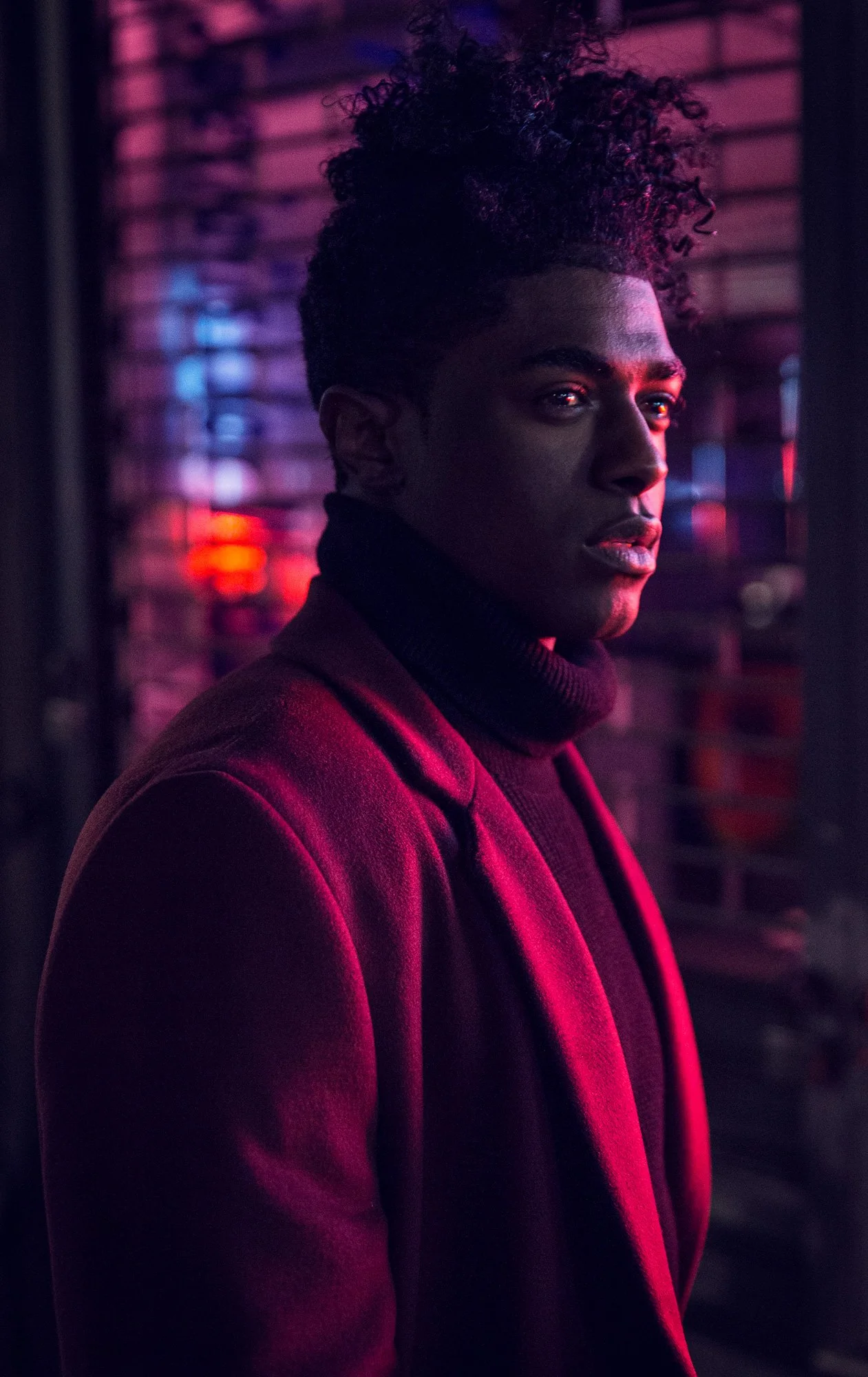 Portrait of a man with curly hair, standing in front of neon lights at night, wearing a dark turtleneck and jacket.