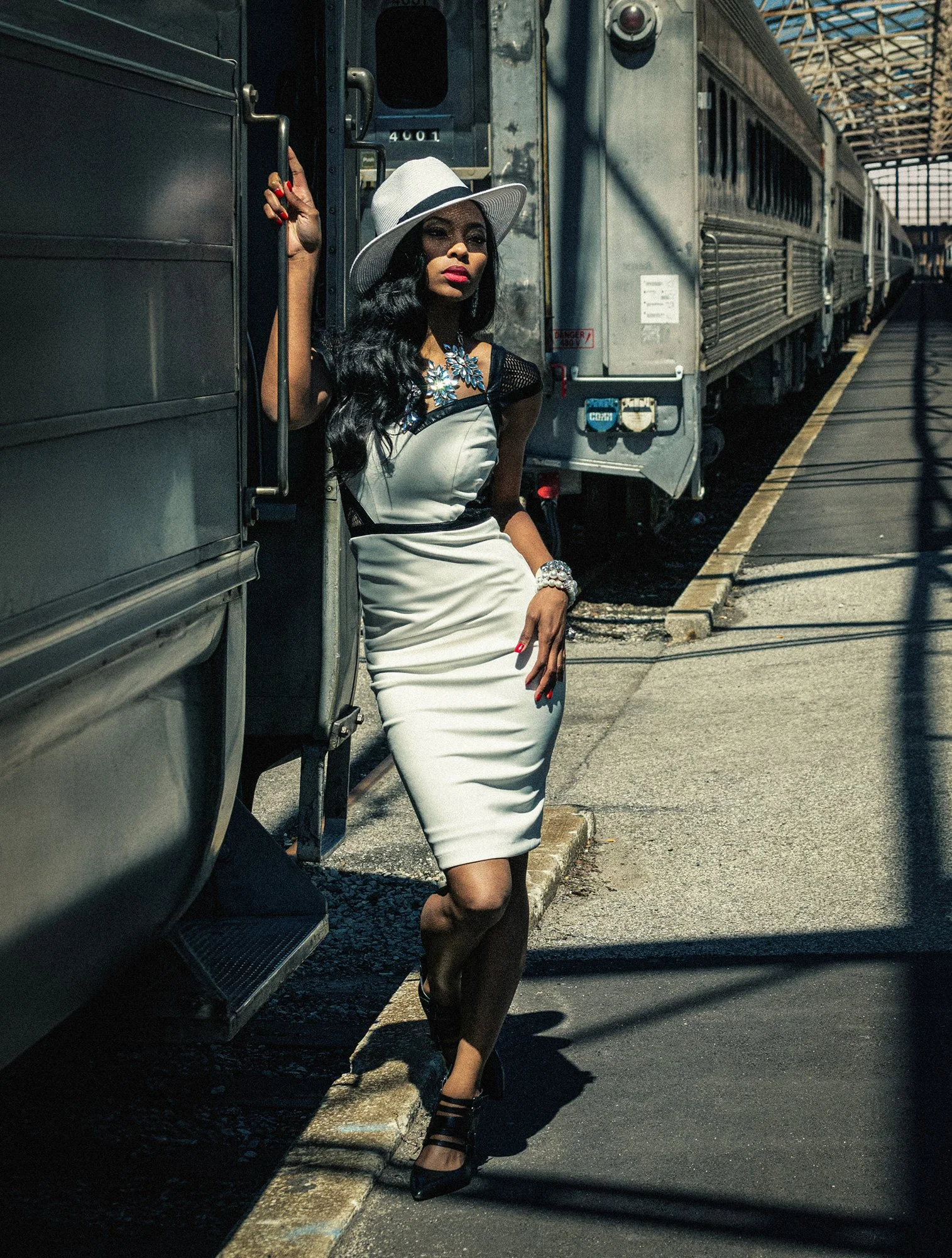 Elegant woman in a classy white dress and hat standing near a retro train with a film noir vibe.