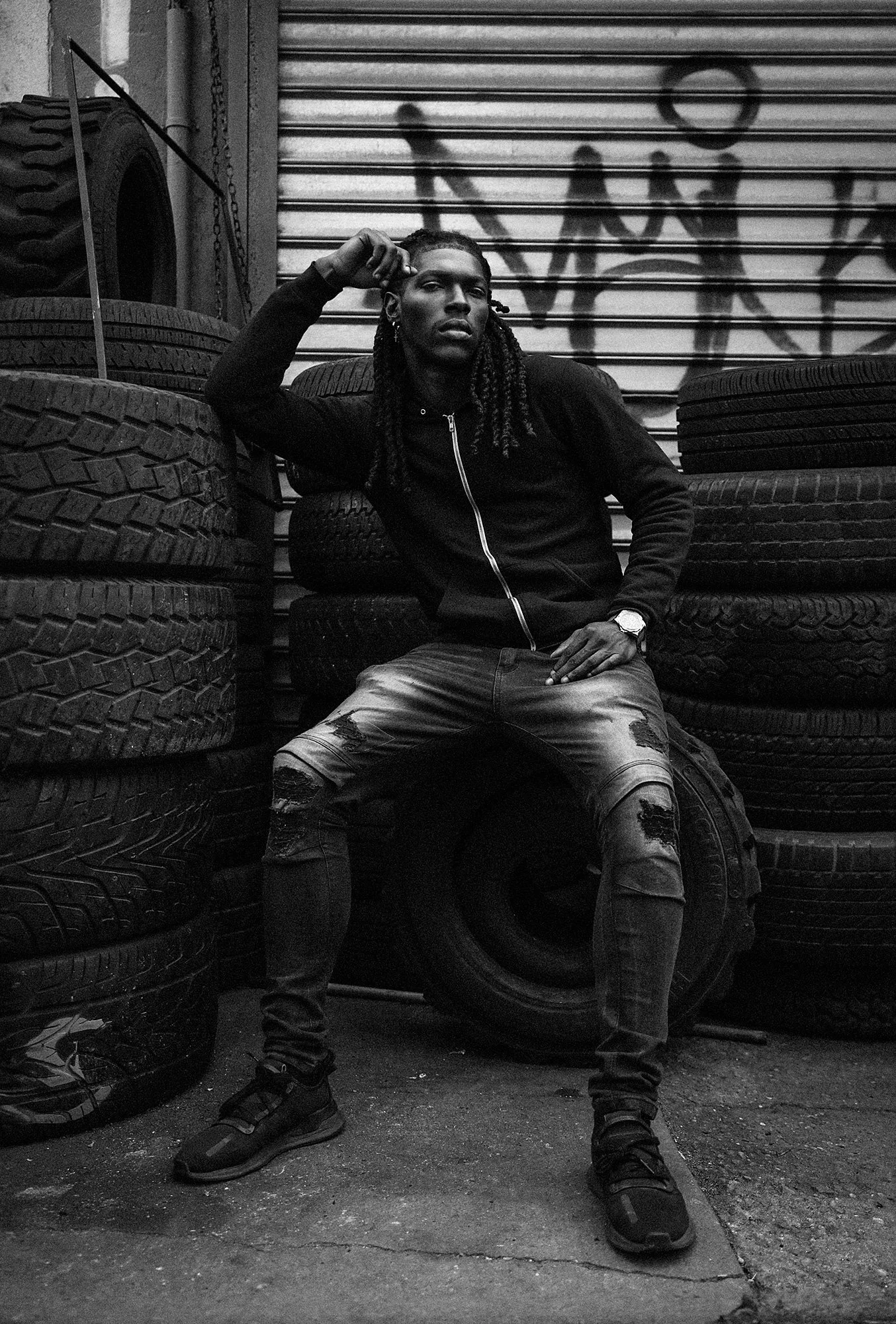 Portrait of a man sitting in front of a tire shop with graffiti on the shutters in the background, captured in black and white.